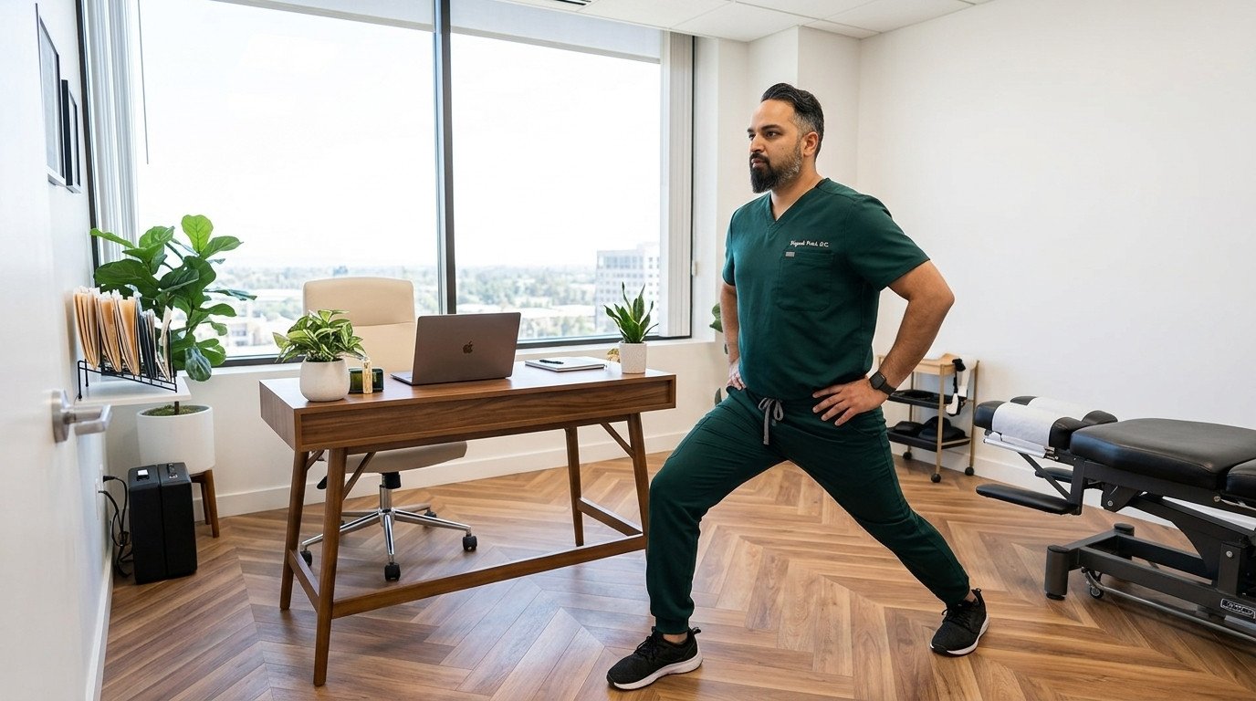 Dr. Patel demonstrating a hip flexor stretch for desk workers at Brooklyn Chiropractic Care, 112 Greenpoint Ave