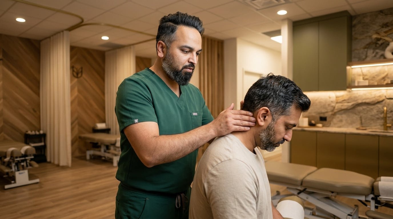 Suboccipital muscle release. I work the four small muscles at the base of your skull manually. Trigger points in these muscles are some of the most reliable headache generators I know. The pressure is intense but most patients say it “hurts in a good way.” You’ll feel the headache start to loosen within a few minutes.